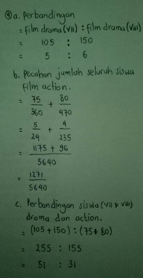Pecahan yang menyatakan jumlah seluruh siswa kelas 7 dan kelas 8 yang memilih film action adalah. We did not find results for: Maybe you would like to learn more about one of these? Check spelling or type a new query.
